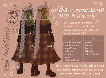 By purchasing a commission from me (Callie/sootandsalad) you agree to be purchasing my services only. If you have a problem with any of the below conditions, they may be changed if discussed with me prior to paying for your commissioned piece.Please read the terms carefully:I, Callie/sootandsalad: